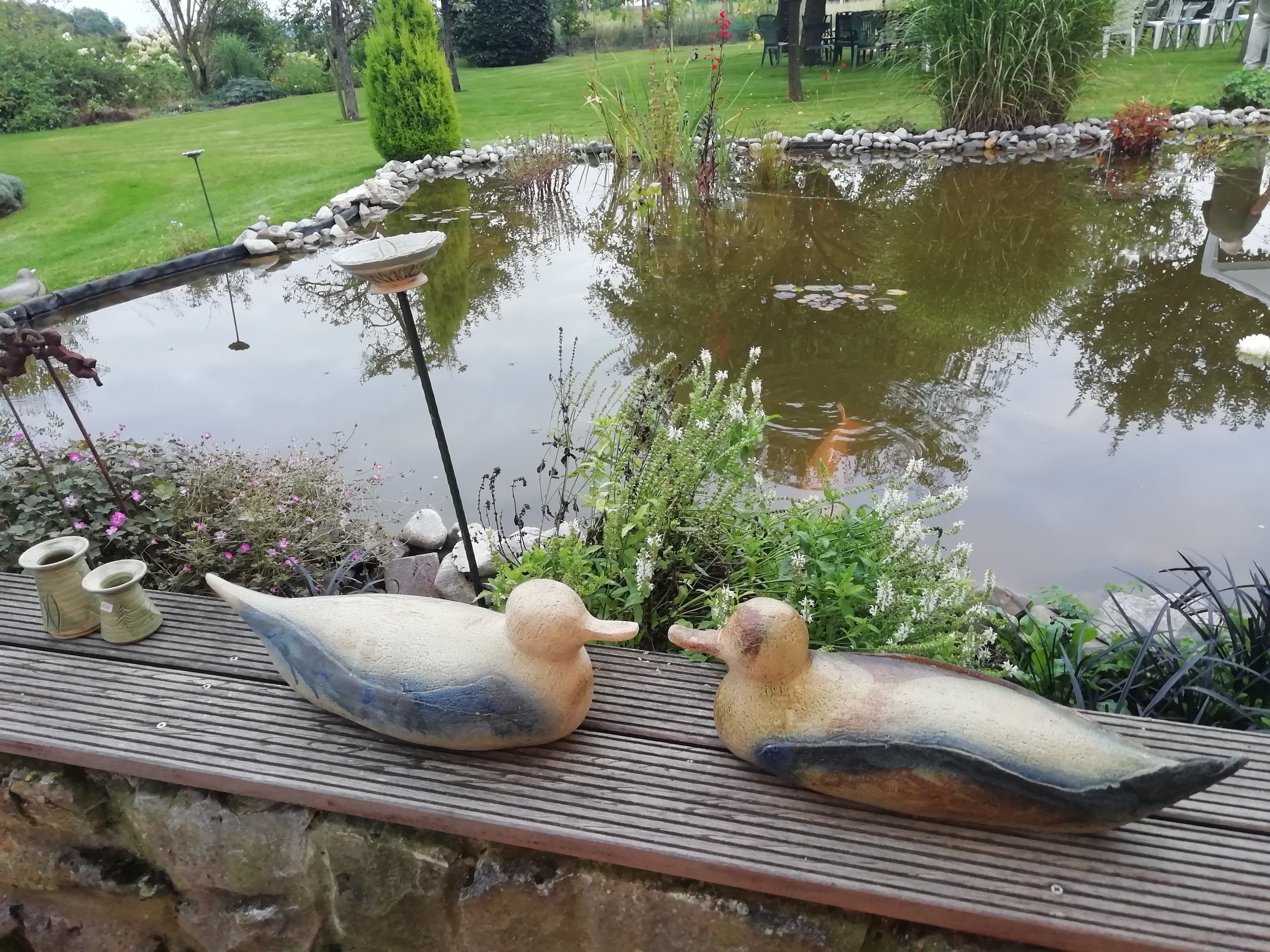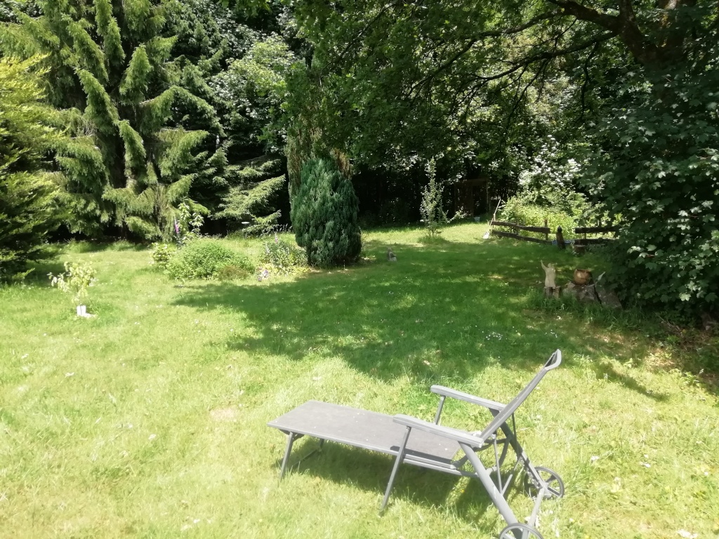 La maison est accueillante et abrite l’atelier céramique. Agréablement entourée d’un grand jardin fleuri, avec son petit plan d’eau, elle donne accès direct à notre petit bois.